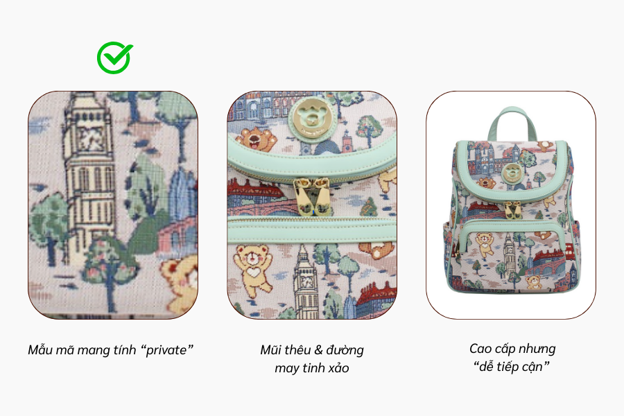 Khác biệt lớn nhất giúp Henney Bear không thể bị đánh đồng với các thương hiệu khác chính là chất liệu dệt Tapestry độc quyền phong cách châu Âu. Thay vì in hay dập công nghiệp, hình ảnh gấu Teddy và các khung cảnh châu Âu được dệt trực tiếp bằng sợi, tạo chiều sâu, độ sắc nét và cảm giác nghệ thuật rõ rệt. Nhờ đó, màu sắc bền đẹp, không bong tróc hay phai màu theo thời gian, giúp Henney Bear giữ giá trị sử dụng lâu dài và càng dùng càng đẹp, vượt trội so với các dòng túi gấu phổ thông.