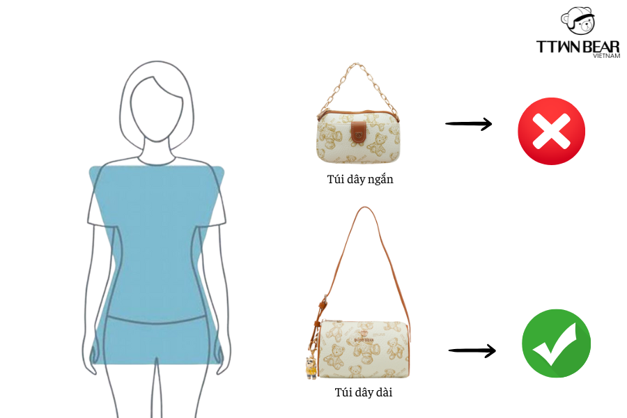 Không nên chọn những túi xách có dây ngăn tạo khoảng cách với chiều cao ---> Nên chọn túi đeo vai ngay thắt lưng hoặc túi có dây đeo dài.