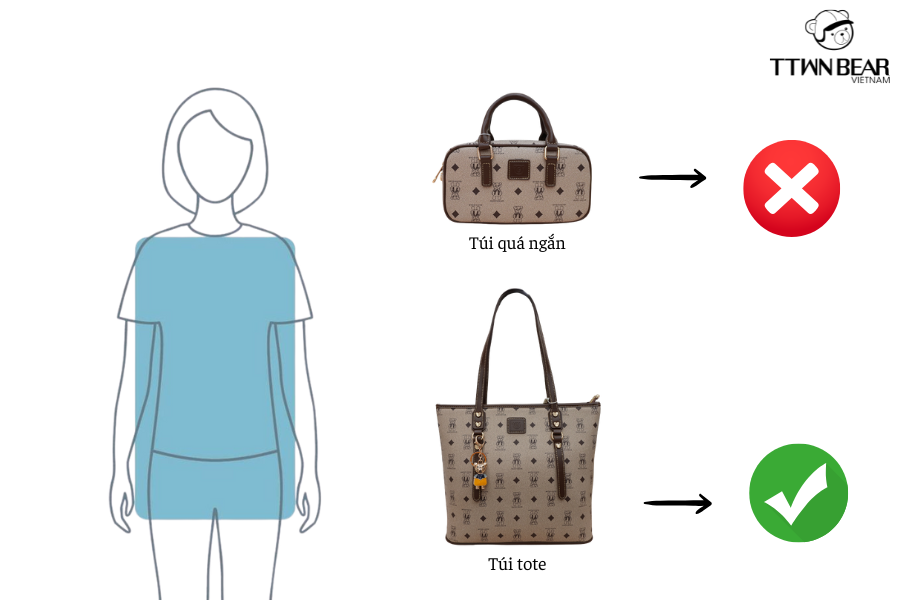 Không nên chọn túi xách quá cứng hoặc quá dài ---> Nên chọn túi ngang hông như túi tote.